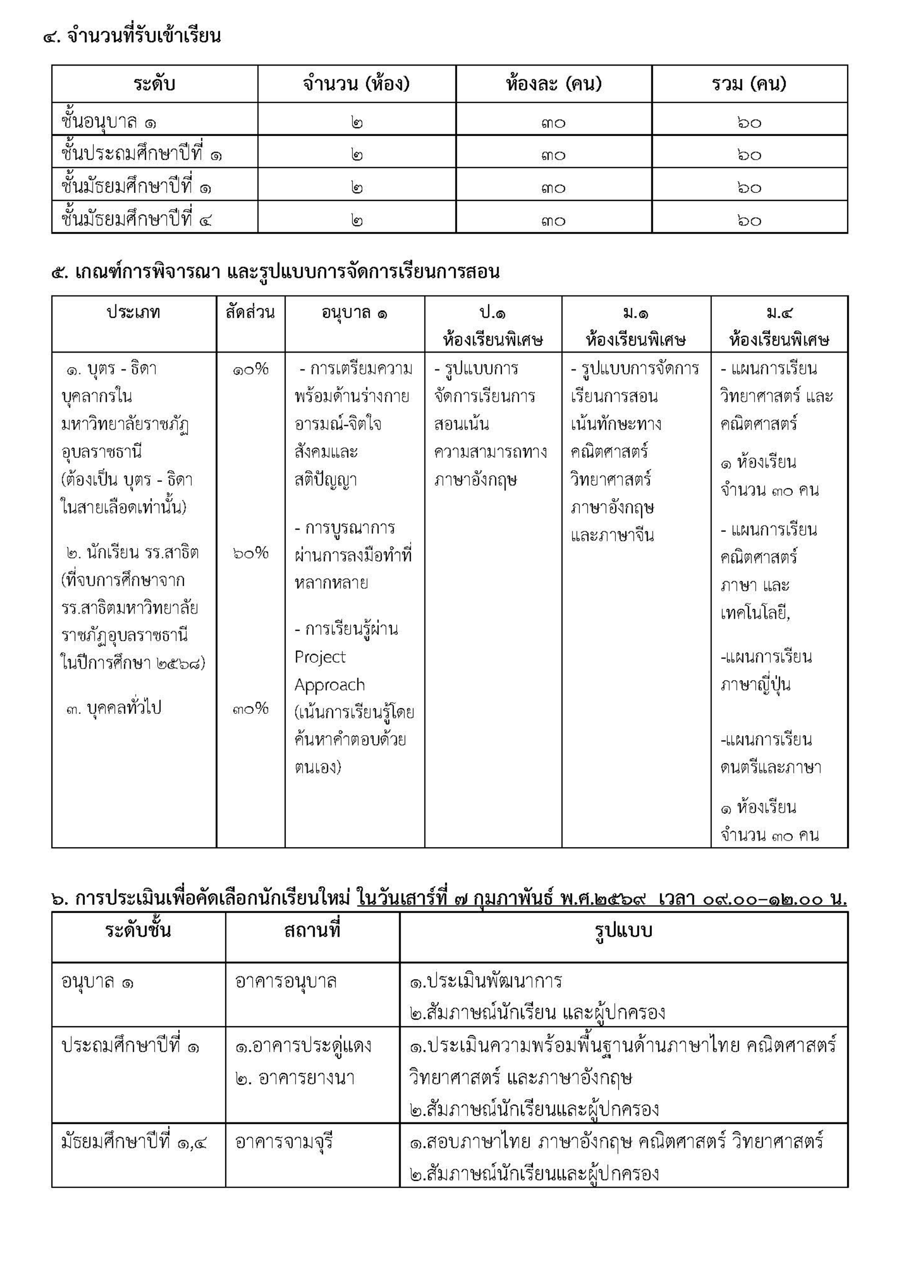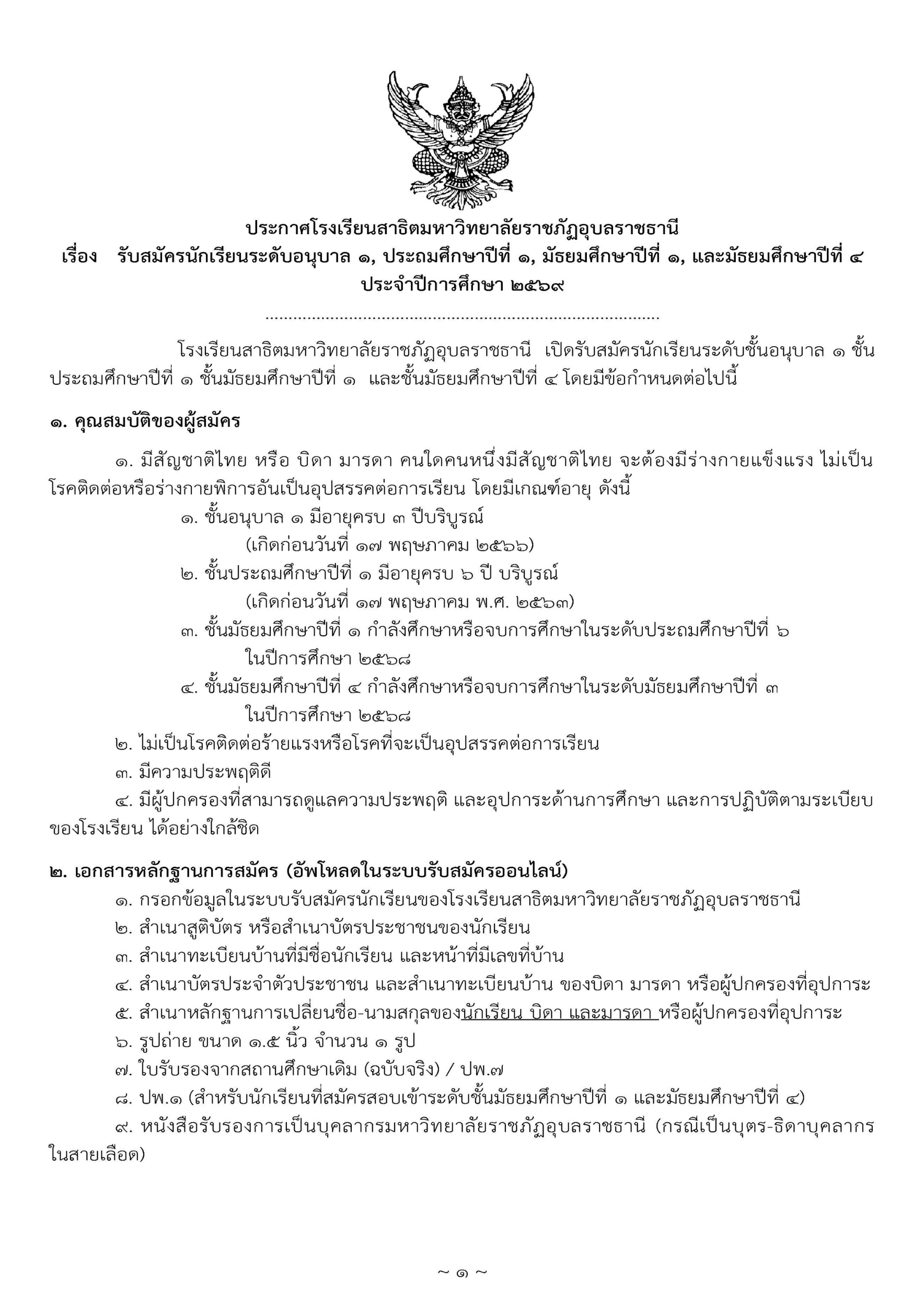 โรงเรียนสาธิตมหาวิทยาลัยราชภัฏอุบลราชธานี เปิดรับสมัครนักเรียนใหม่ ปีการศึกษา ๒๕๖๙