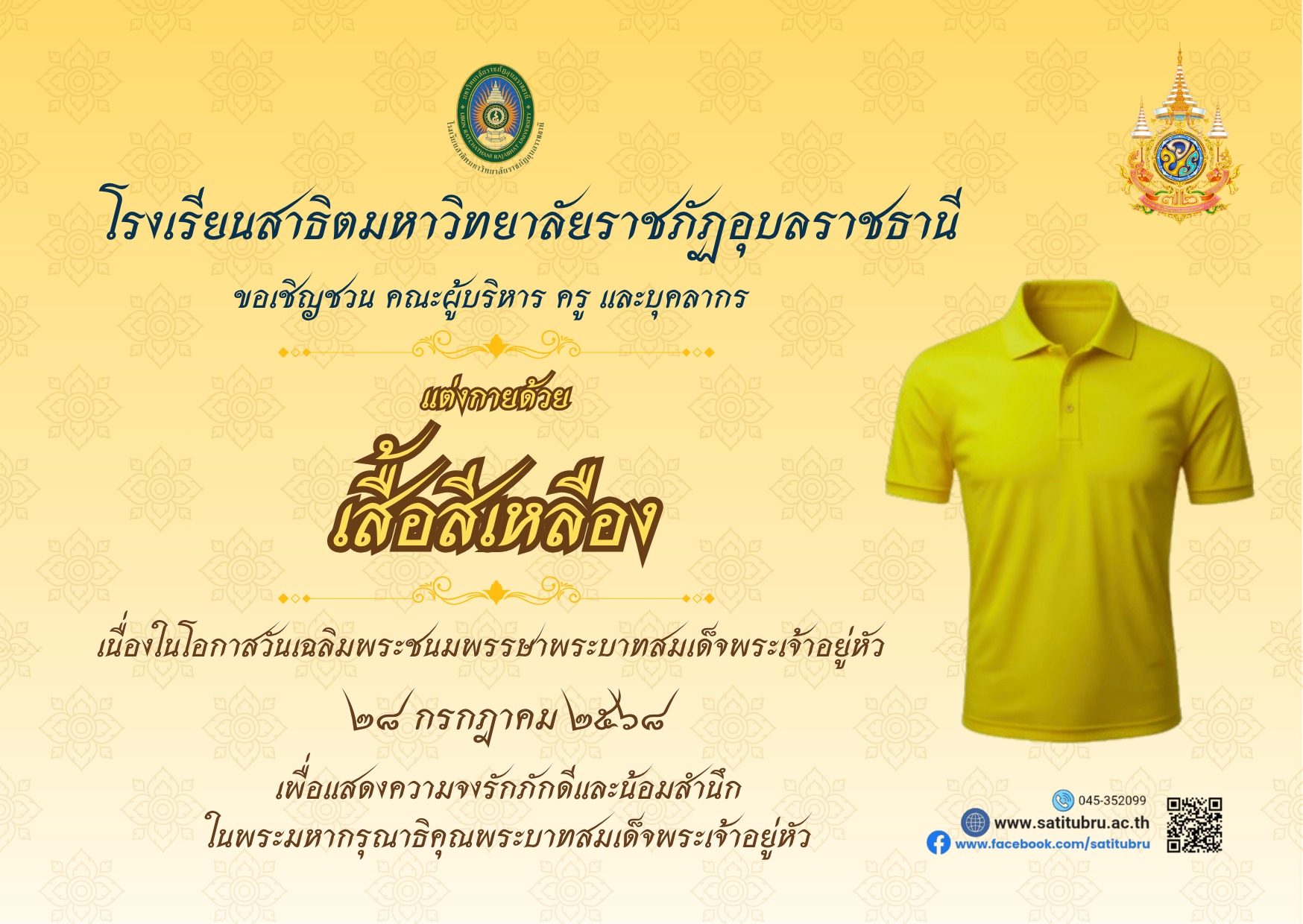 โรงเรียนสาธิตมหาวิทยาลัยราชภัฏอุบลราชธานี #ขอเชิญชวน คณะผู้บริหาร ครู และบุคลากร แต่งกายด้วยเสื้อสีเหลือง