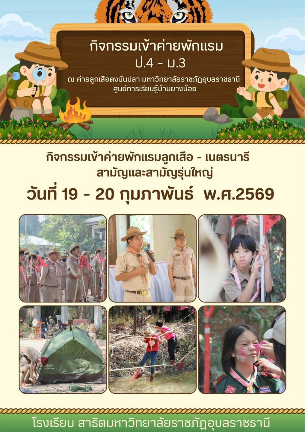 โรงเรียนสาธิตมหาวิทยาลัยราชภัฏอุบลราชธานี จัดกิจกรรมเข้าค่ายพักแรมลูกเสือ–เนตรนารี สามัญและสามัญรุ่นใหญ่ ระหว่างวันที่ 19–20 กุมภาพันธ์ พ.ศ. 2569 ณ ค่ายลูกเสือดงมันปลา มหาวิทยาลัยราชภัฏอุบลราชธานี (ศูนย์การเรียนรู้บ้านยางน้อย)