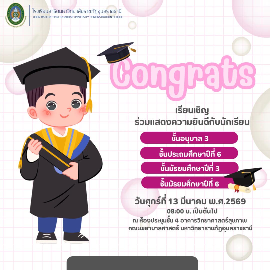 โรงเรียนสาธิตมหาวิทยาลัยราชภัฏอุบลราชธานี ขอเชิญผู้ปกครอง ผู้บริหาร คณะครู บุคลากร และแขกผู้มีเกียรติ ร่วมแสดงความยินดีกับนักเรียนผู้สำเร็จการศึกษา ในกิจกรรม ปัจฉิมนิเทศ ประจำปีการศึกษา ๒๕๖๘