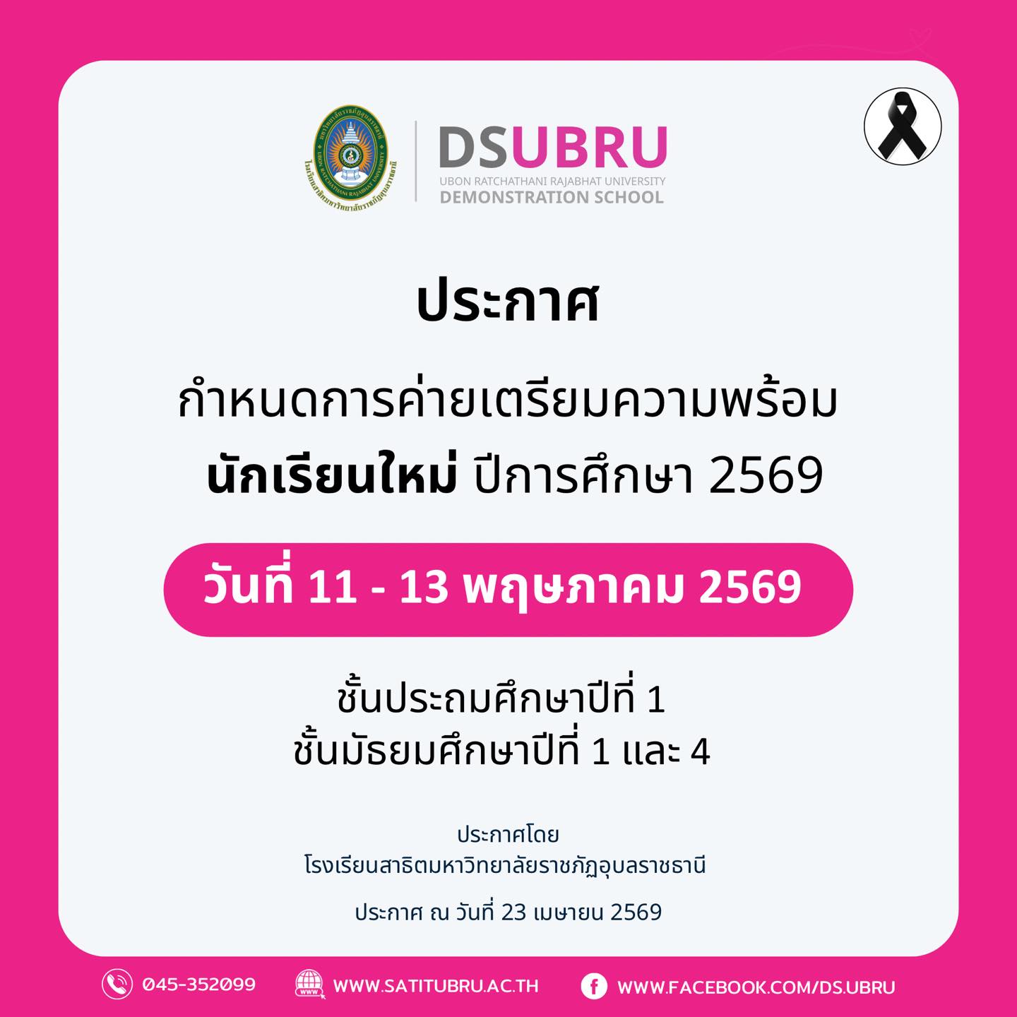 โรงเรียนสาธิตมหาวิทยาลัยราชภัฏอุบลราชธานี ขอแจ้งนักเรียนและผู้ปกครองทราบ กำหนดการจัดกิจกรรม “เตรียมความพร้อมก่อนเปิดภาคเรียน” สำหรับนักเรียนใหม่ ประจำปีการศึกษา 2569 โดยมีกำหนดจัดขึ้นระหว่างวันที่ 11 – 13 พฤษภาคม 2569 ณ โรงเรียนสาธิตมหาวิทยาลัยราชภัฏอุบลราชธานี